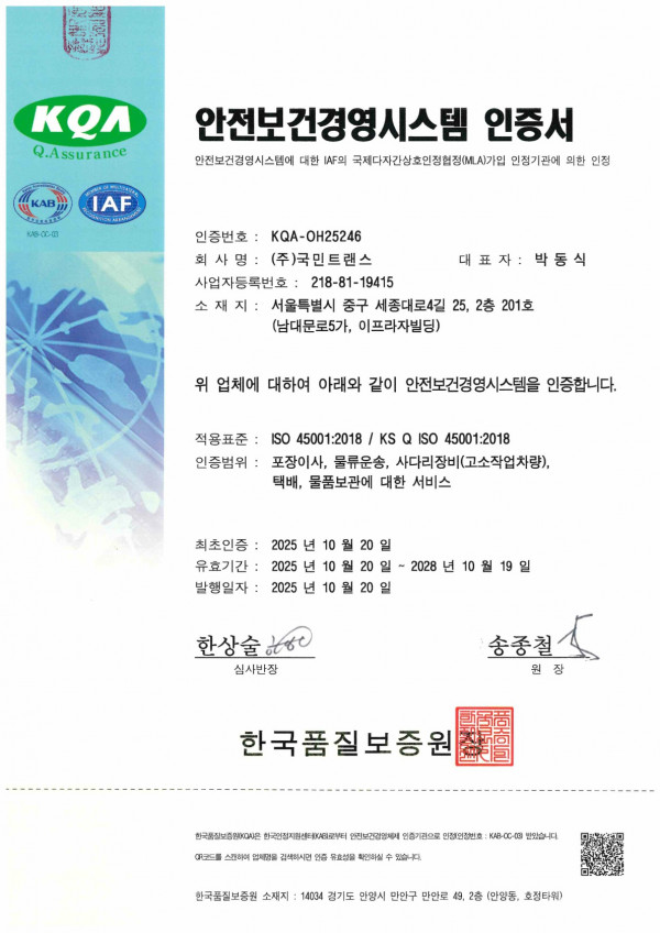 국민트랜스 안전보건경영시스템(ISO 45001) 인증 취득